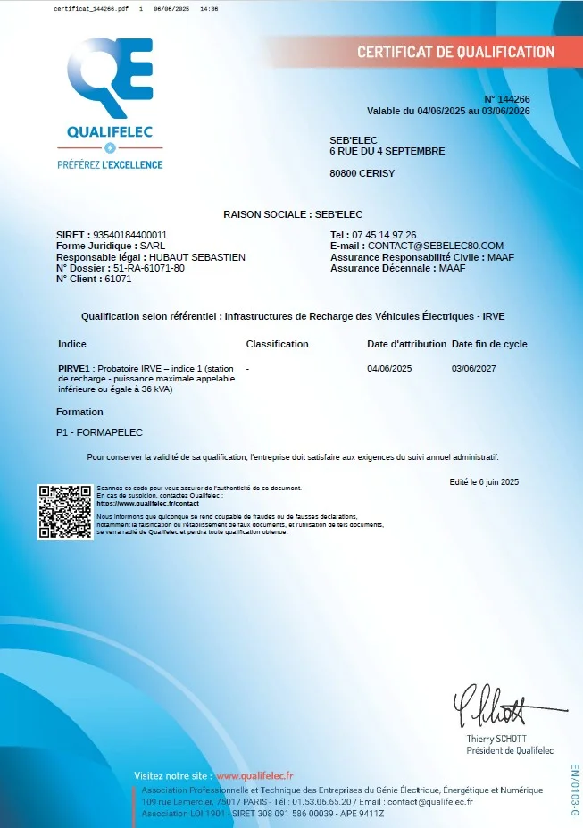 SEB'ELEC une entreprise certifiées pour la pose de bornes de recharge sur Amiens et ses environs. En tant qu'entreprise spécialisée dans l'électricité générale, SEB'ELEC offre une expertise inégalée dans l'installation de solutions électriques modernes et durables. Notre équipe est à l'écoute de chaque client pour comprendre et répondre à leurs besoins spécifiques.